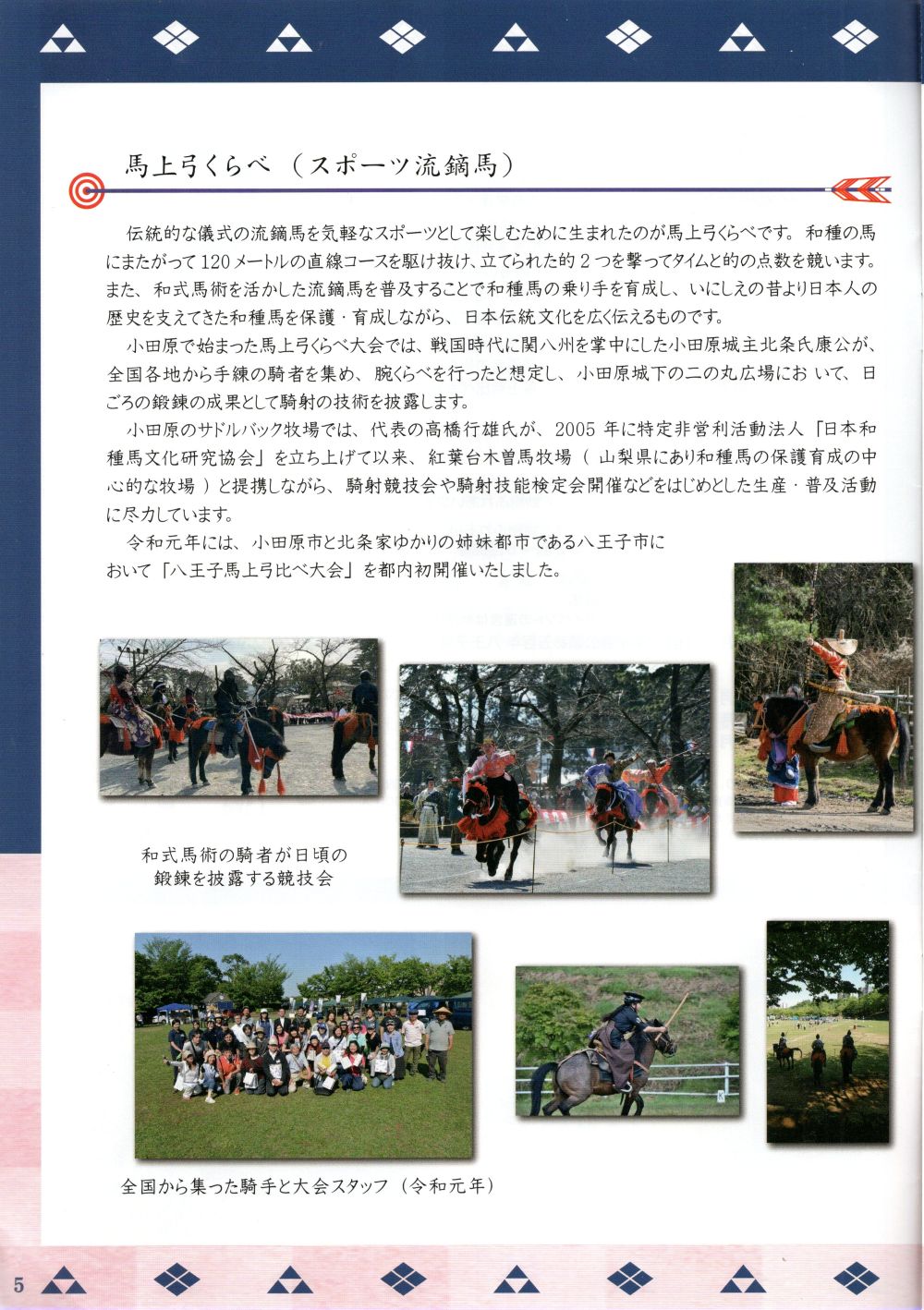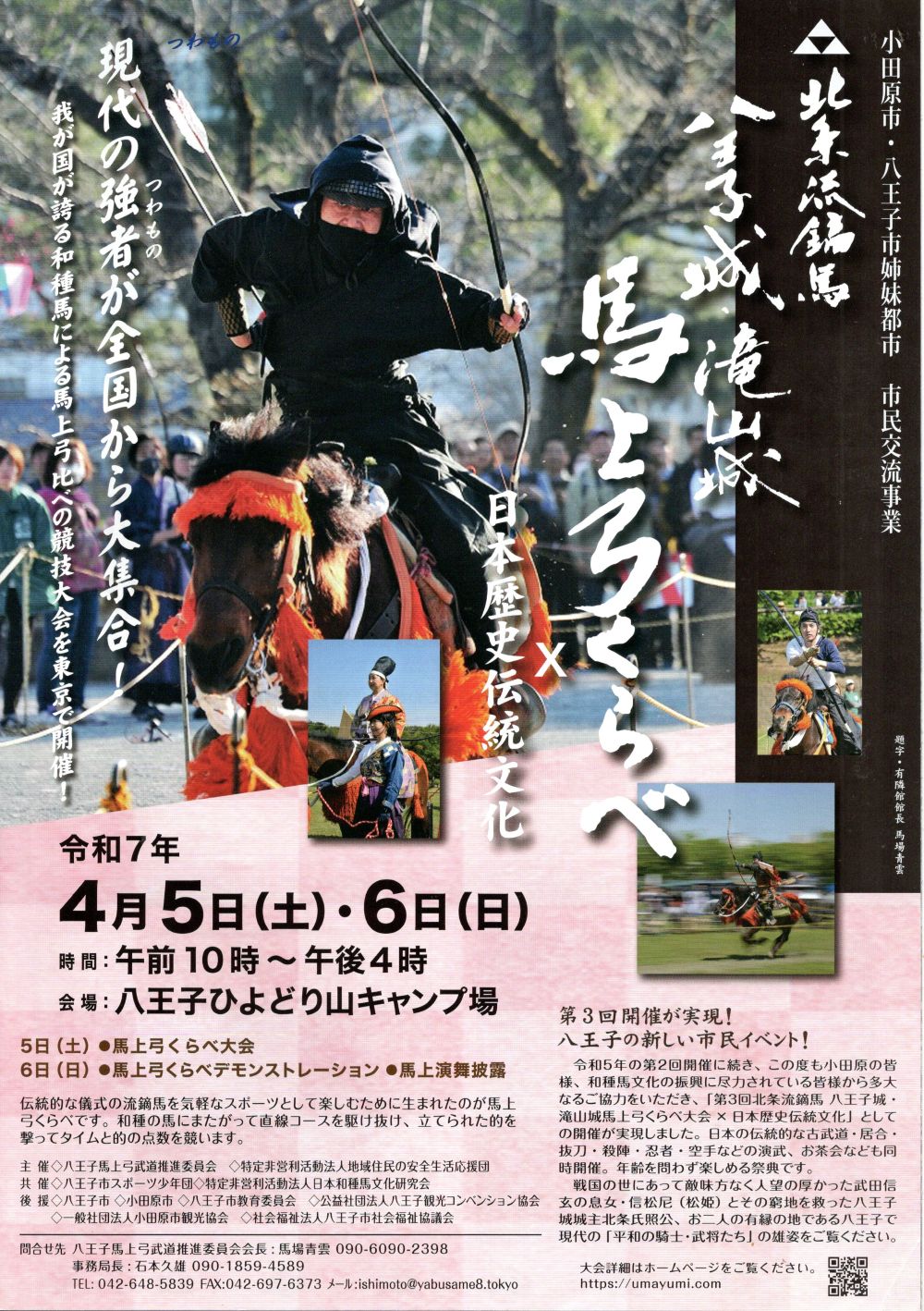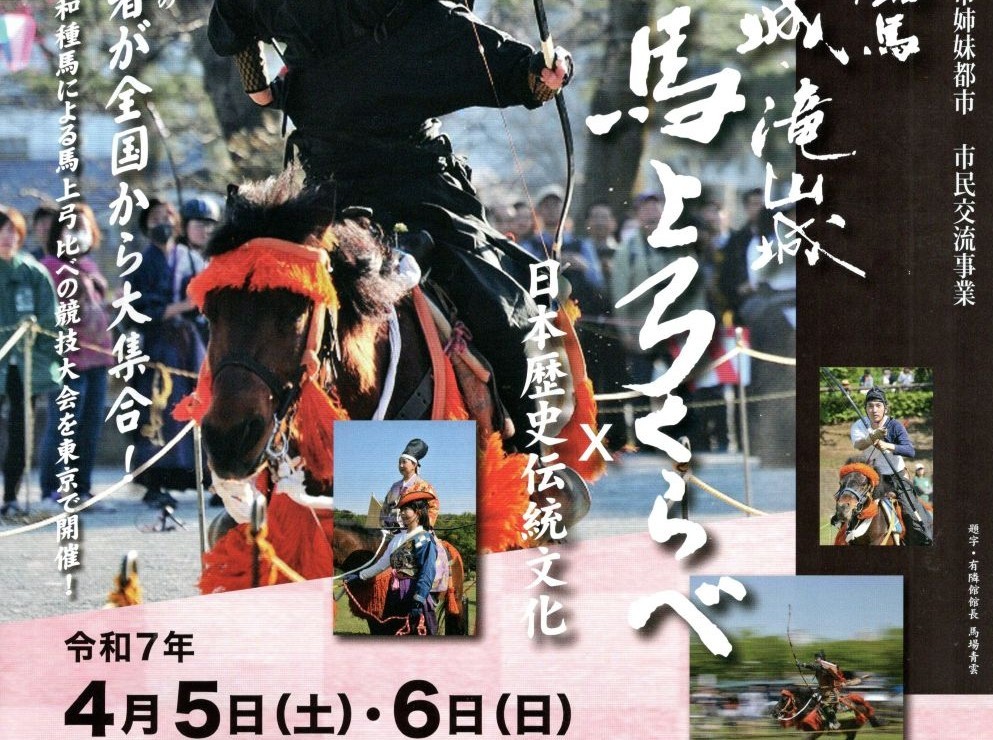 ブログ 06Apr2025 北条流流鏑馬 弓くらべ 2025年4月5日(土) 6日(日) 午前10時~午後4時 会場は八王子ひよどり山キャンプ場にて、和種馬による馬上弓くらべ大会が開催されました。伝統的な儀式の流鏑馬を気軽なスポーツとして楽しむために生まれた馬上弓くらべ。 ルナ憲一は鉢形城主(埼玉県寄居町)として北条家を支えた北条氏邦に扮し馬上行進 RSS ブログ 特捜最前線 同窓会 しだれ桜 満開です 関連記事一覧 シャボン玉 ルナ憲一ブログはじまります 特捜最前線 同窓会 のどにレンコン湯 サロンコンサート ご案内 謹賀新年2022